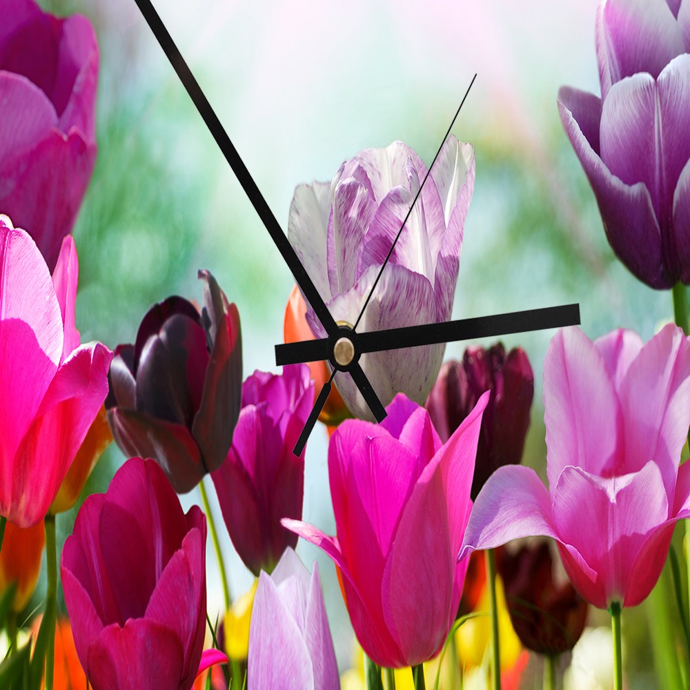 Zaoblené nástenné hodiny s dekoratívnym obrázkom farebných tulipánov