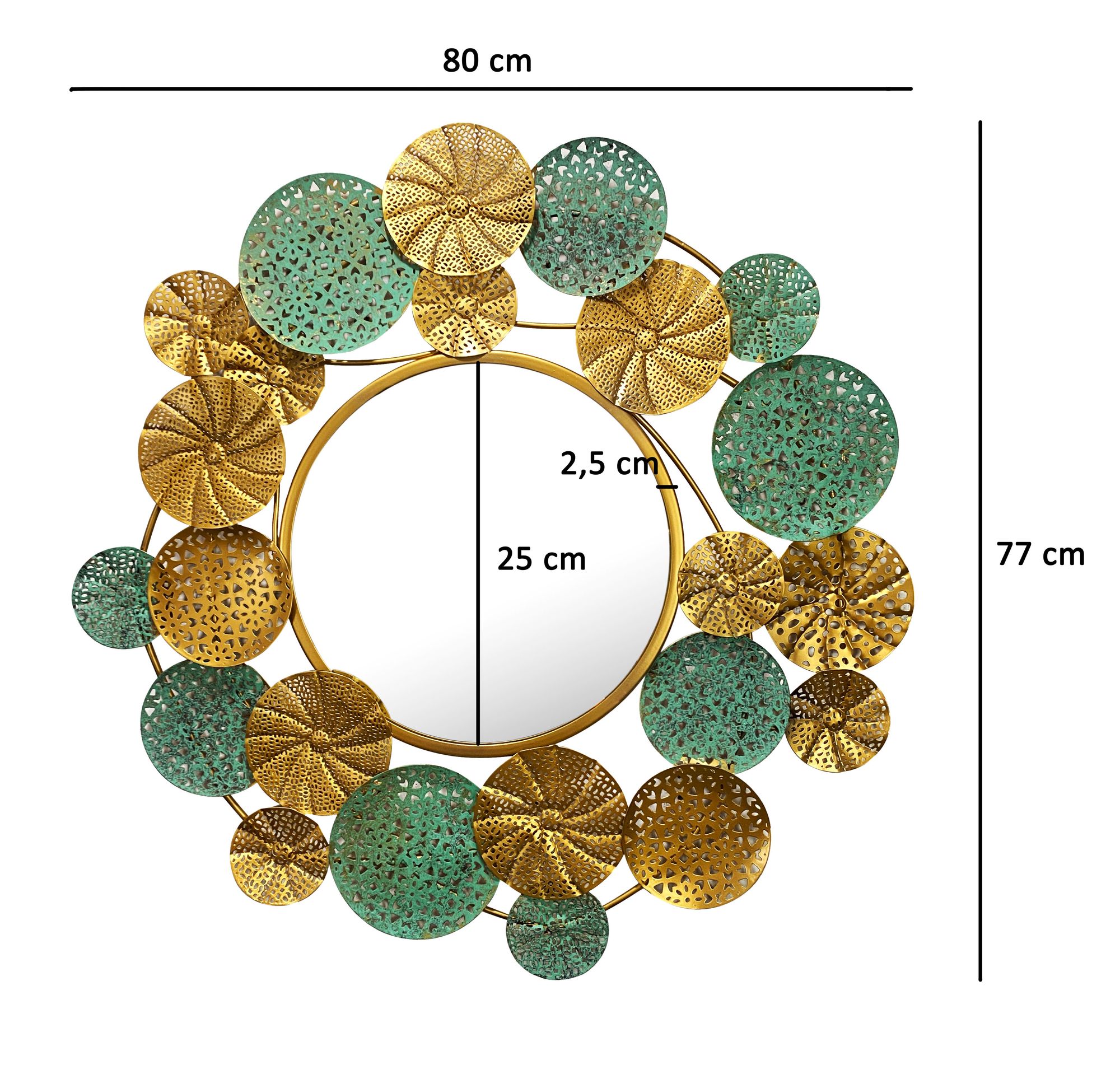 Informácie o výrobku "Okrúhle nástenné zrkadlo sklo a patinované zlaté železo | 80x77 cm | Zlatý rám so zelenou patinou"