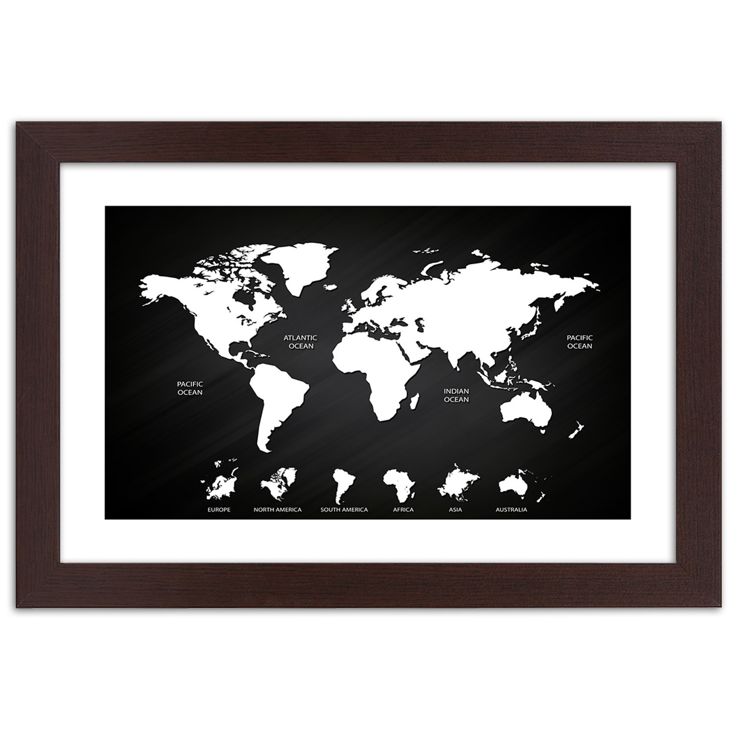 - Rám „Kontrastná mapa sveta a kontinentov“ vytlačený na saténovom papieri s rámom z MDF (vlákno strednej hustoty).