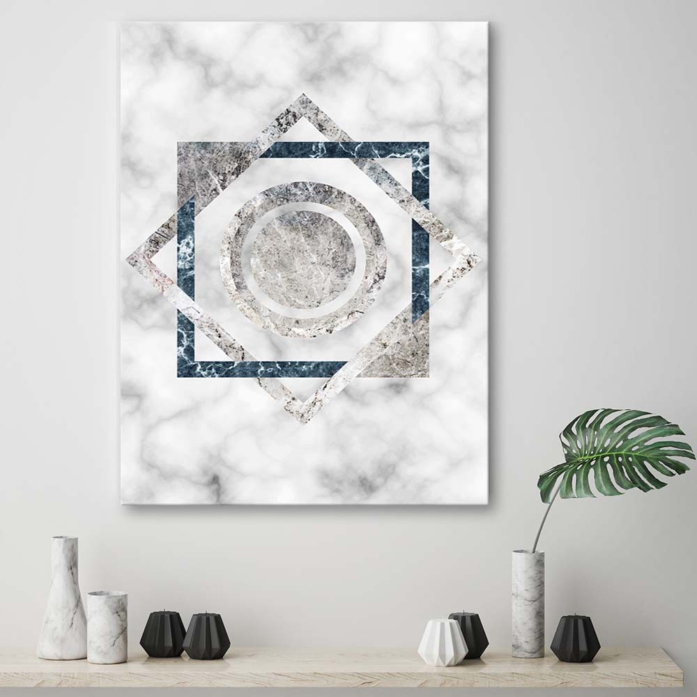 Informácie o výrobku "Závesný rám mdf potlačený na jednodielnom plátne, štvorce a kruhy, povrchová úprava mramor"