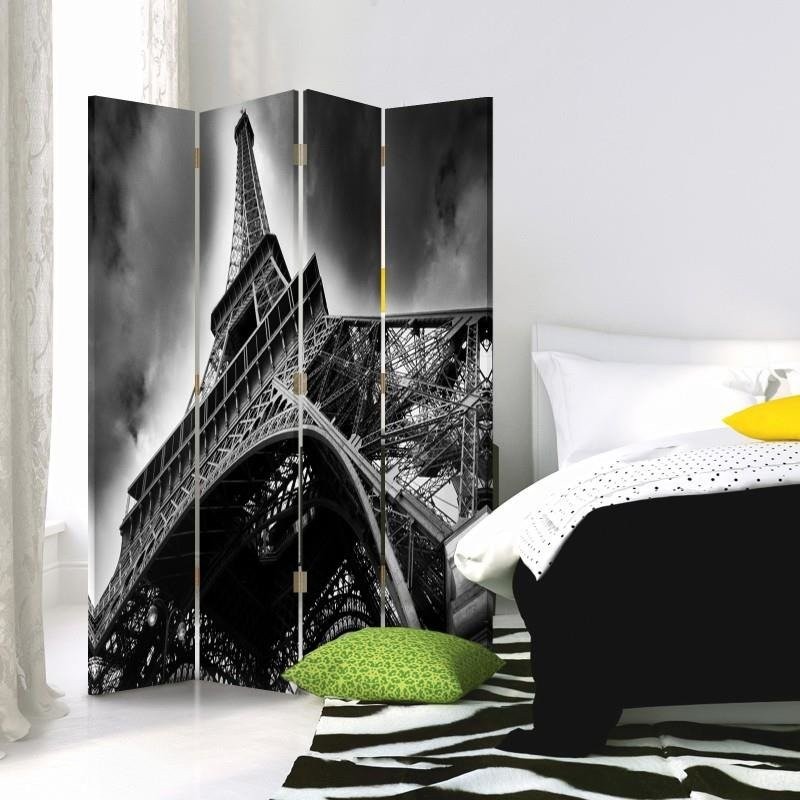 Obojstranná zástena 145 cm vyrobená z mdf a plátna s obrázkom eiffelovej veže, sivé odtiene