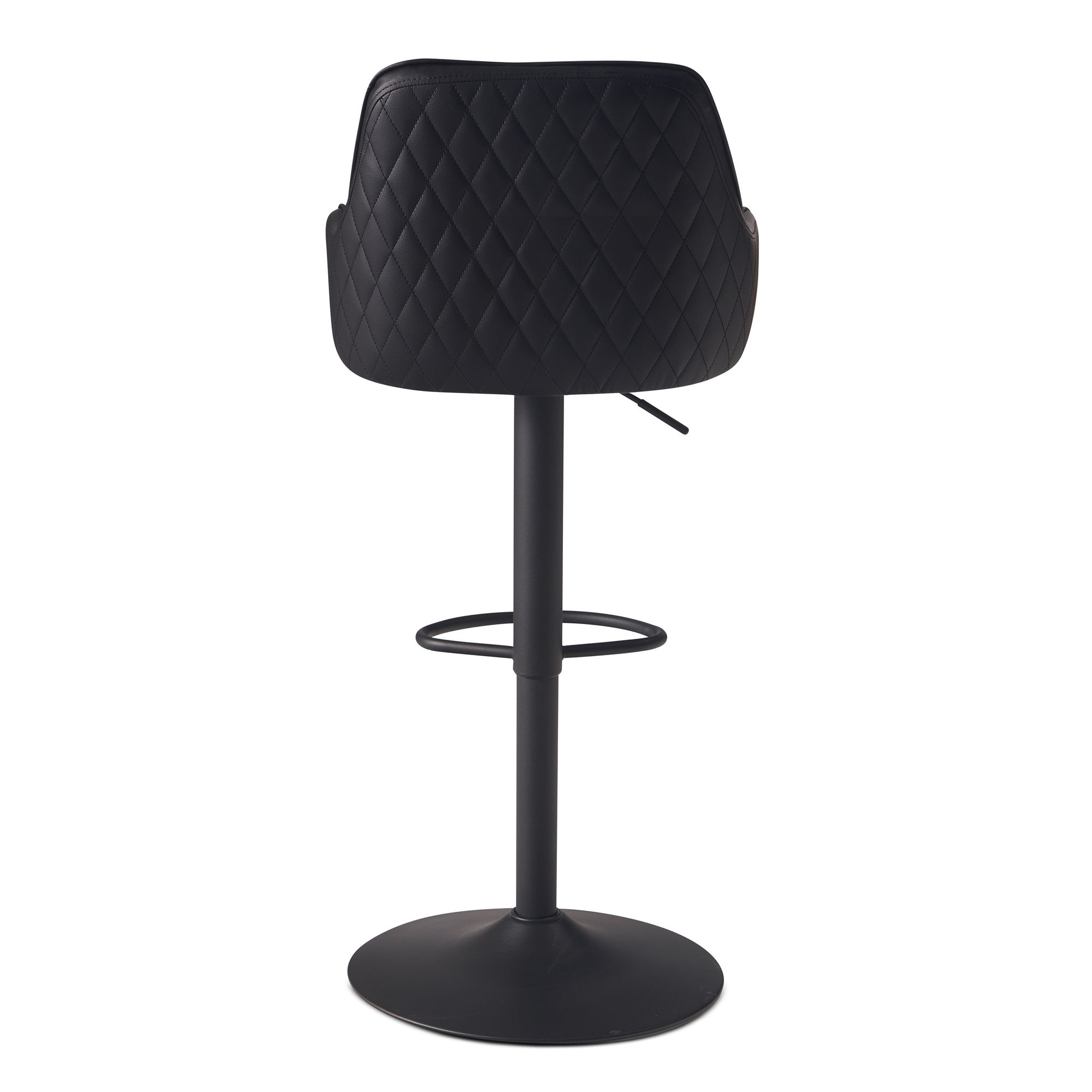 Táto čierna barová stolička z ekologickej kože spája moderný dizajn a praktickosť, nastaviteľná na výšku od 86 do 106 cm. Ergonomicky tvarovaná škrupina s prešívaním v tvare diamantov na podrúčkach a operadle zabezpečuje pohodlné sedenie. Kovový trompetový podstavec poskytuje pevnosť a eleganciu.