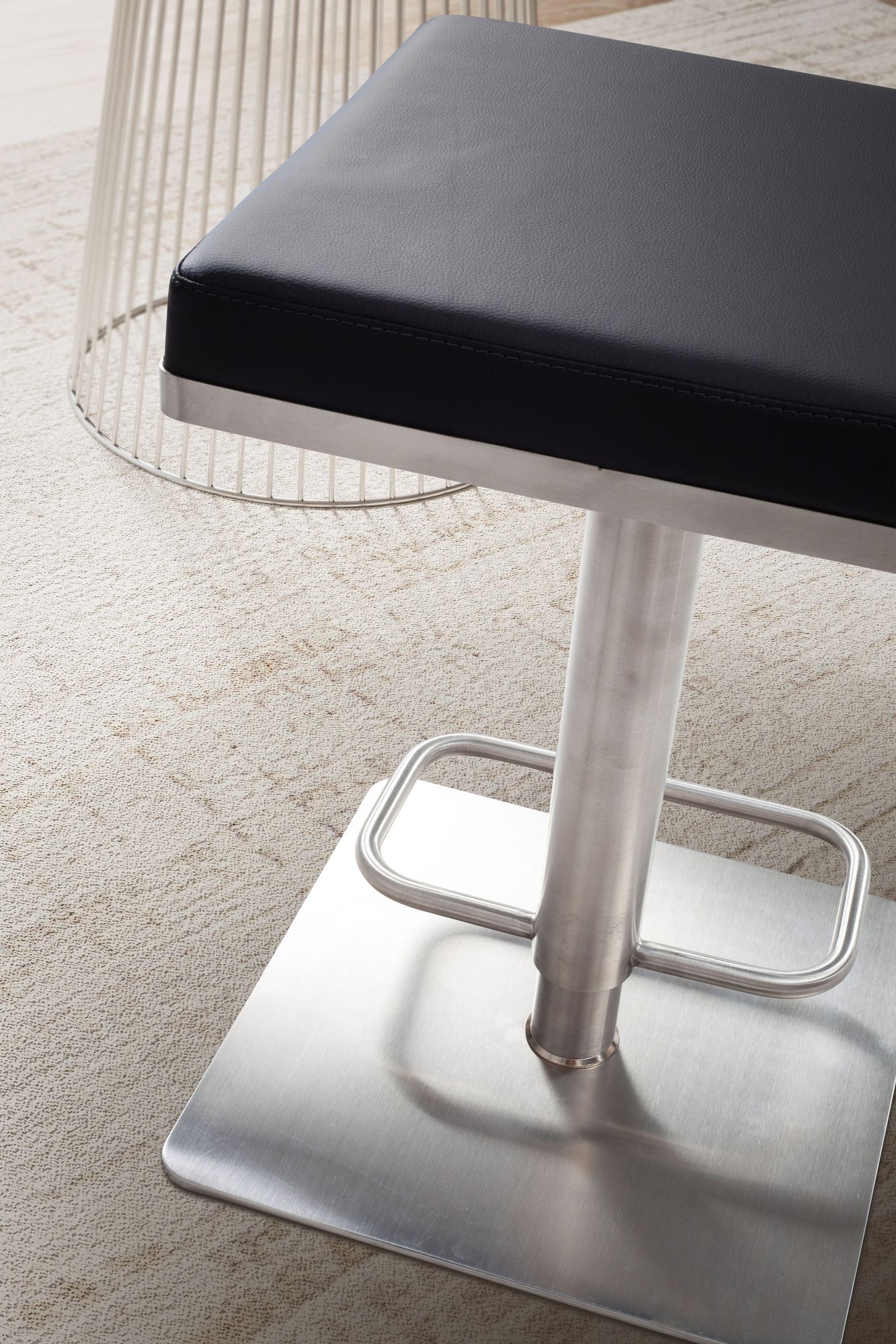 Táto moderná barová stolička kombinuje čierne čalúnenie z umelej kože s kartáčovaným nerezovým rámom. Polstrované sedadlo a nastaviteľná výška (53-82 cm) zaručujú maximálny komfort pre každý bar či kuchyňu.
