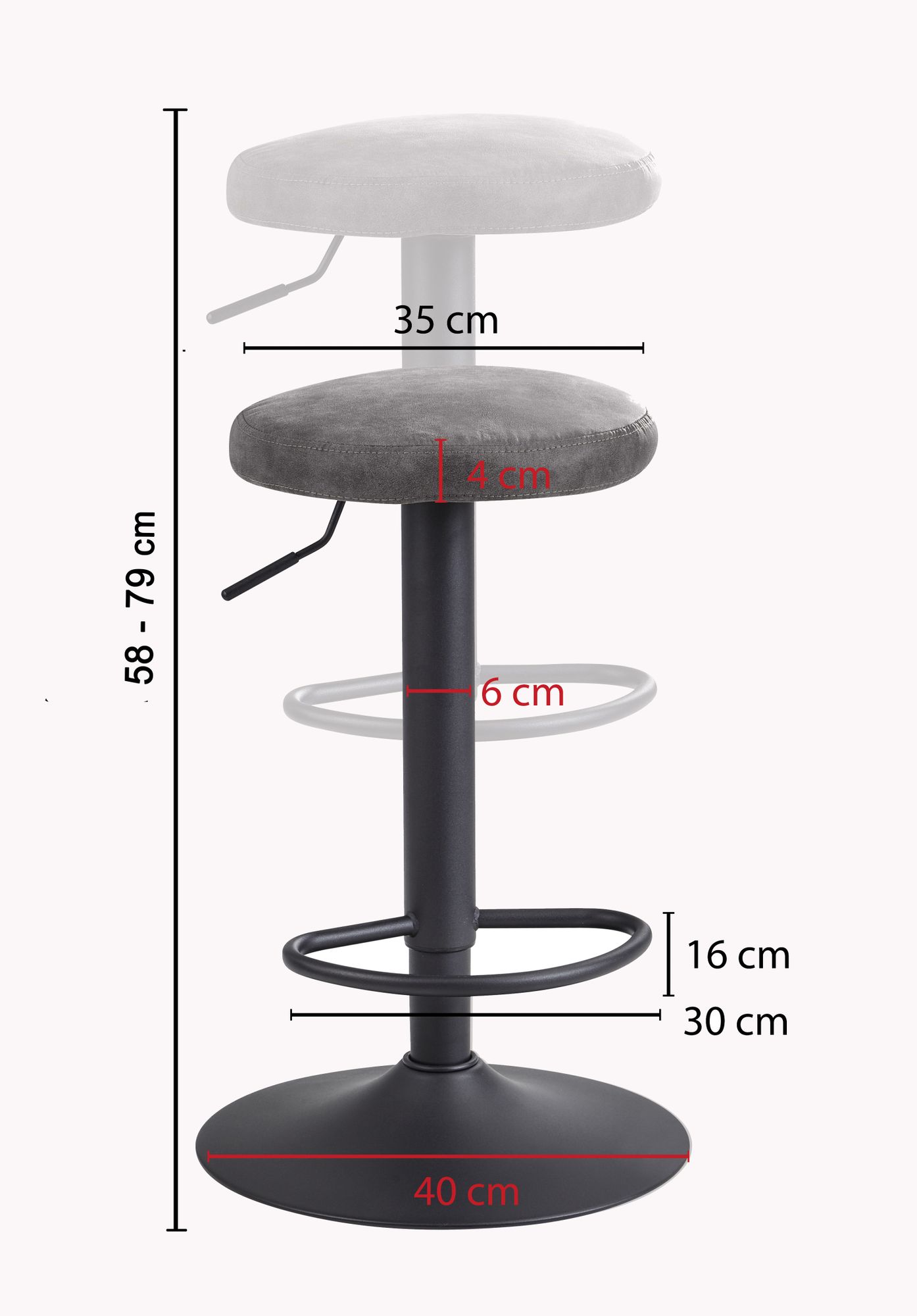 Informácie o výrobku "Sivá barová stolička semišový vzhľad bez operadla | Čierny kov a textília | 40 x 58-79 cm | Nosnosť 100 kg"