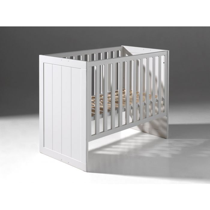 This ERIK babybed (60x120) is made out of chite lacquered MDF. The vertical grooves in the head- and footboard of the bed gives it a finishing touch. You can easily adjust the slat base to 3 heights.