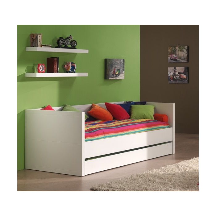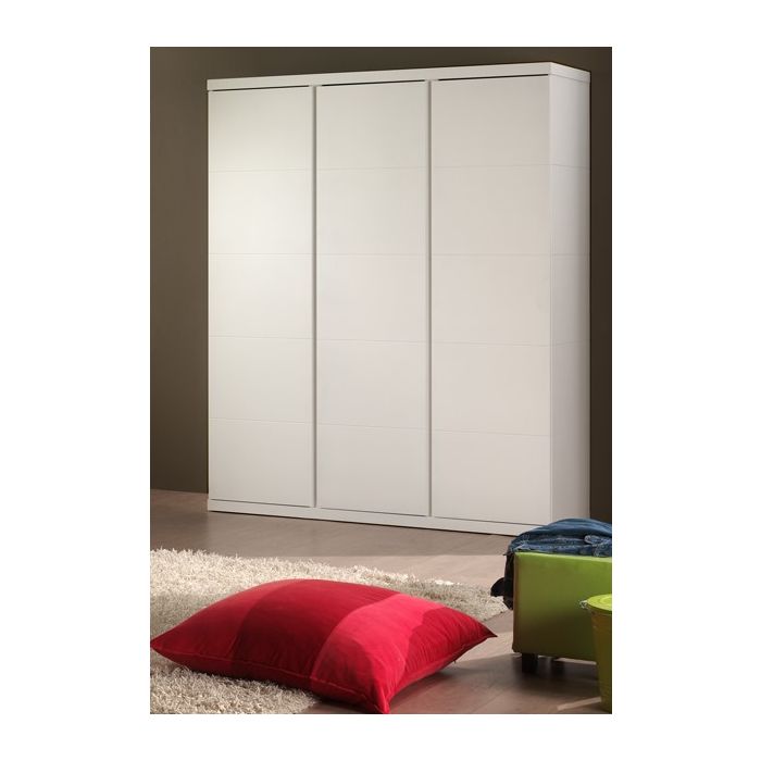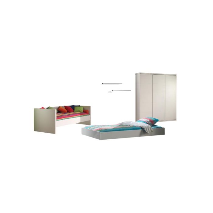 This captain bed (90x200) from the LARA collection is made out of white lacquered MDF in combination with solid pine. The frame work of the bed has horizontal groovesYou can add a personal touch by decorating it with colourful cushions or blankets.Behind the left and right door of the 3 door wardrobe there is a hanging compartment and 1 shelf. In the middle there are 4 shelfs. There's a soft-close system on the doors. You can also display you favorite toys on one of the 2 wall shelfs. The simple yet contemporary design makes it perfect for every kids or young adult bedroom
