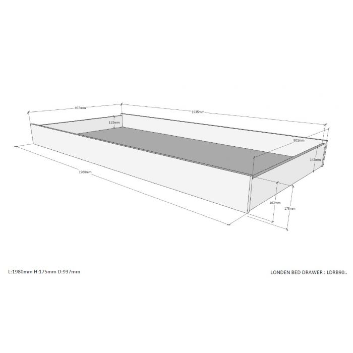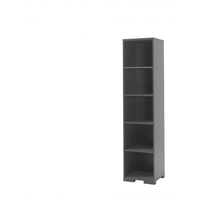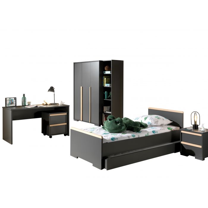 The LONDON bed (90x200) in antracite has a Scandinavian look in combination with the solid pine. The matching drawer can be used as a guest bed or for extra storage. The nightstand in white has 2 drawers with soft-close system. The 3 door wardrobe consist of 2 doors with 2 shelves and 1 hanging rail. There are 4 shelfs behind the third door. The desk has a spacious worktop and the matching trolley can be used for extra storage. . The bookcase is divided in 5 compartments by 4 shelfs and perfect to organise your school books or to display your favourite toysThe perfect stylish addition for every children's or young adult's room.