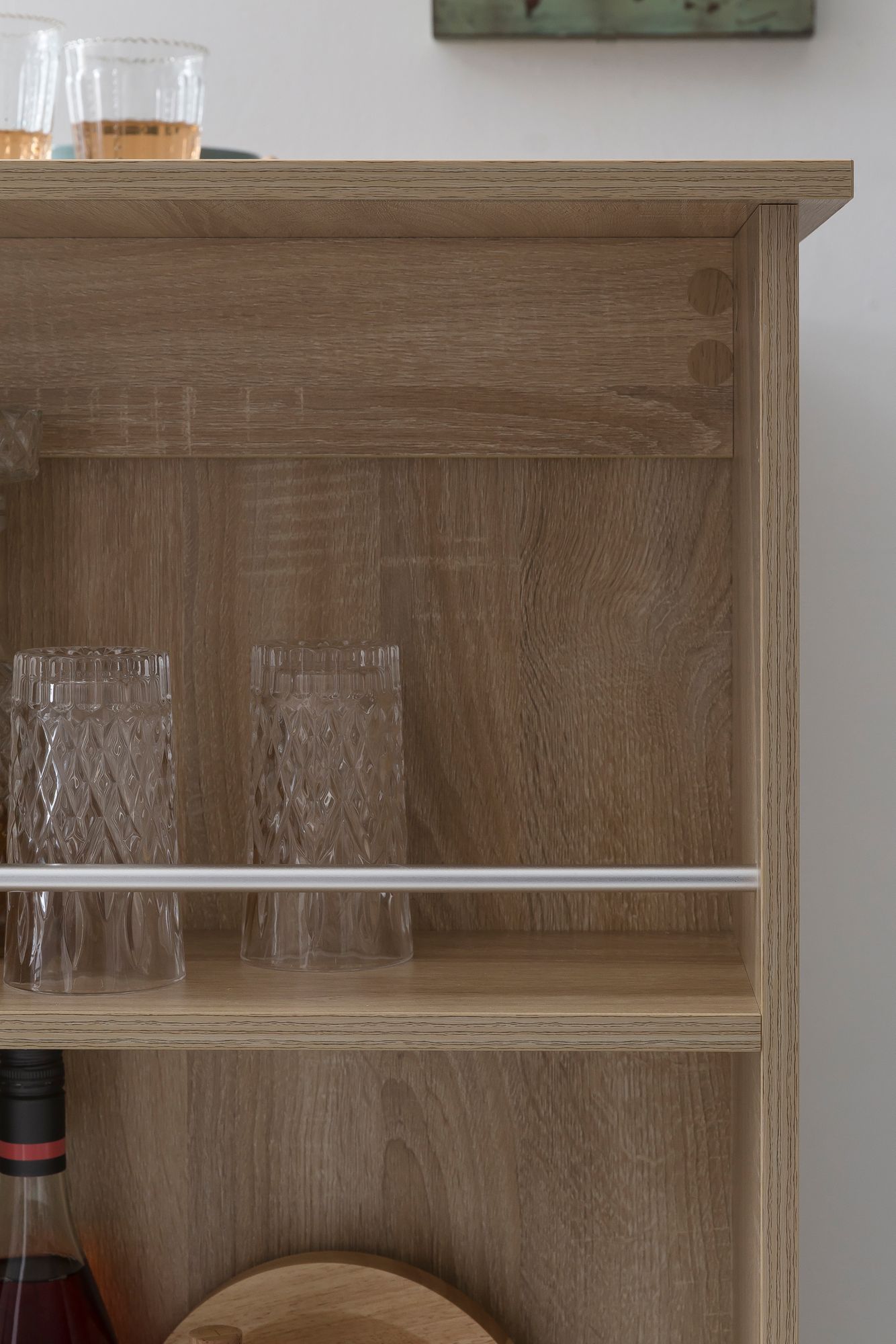 Tento barový stôl Sonoma z dreva kombinuje moderný dizajn s praktickými úložnými priestormi. Jeho priestranná pracovná doska je ideálna na nápoje, riad a občerstvenie, zatiaľ čo tri integrované priehradky poskytujú elegantné úložisko na vínové fľaše, poháre a kuchynské potreby.