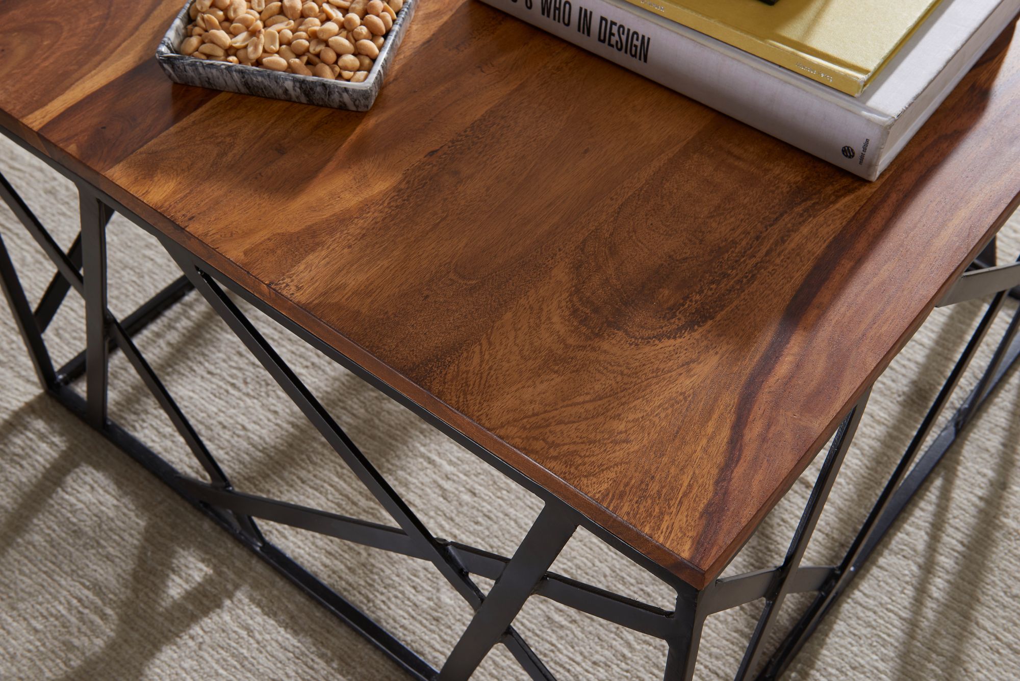 - Materiály: masívne drevo Sheesham, čierne lakovaný kov