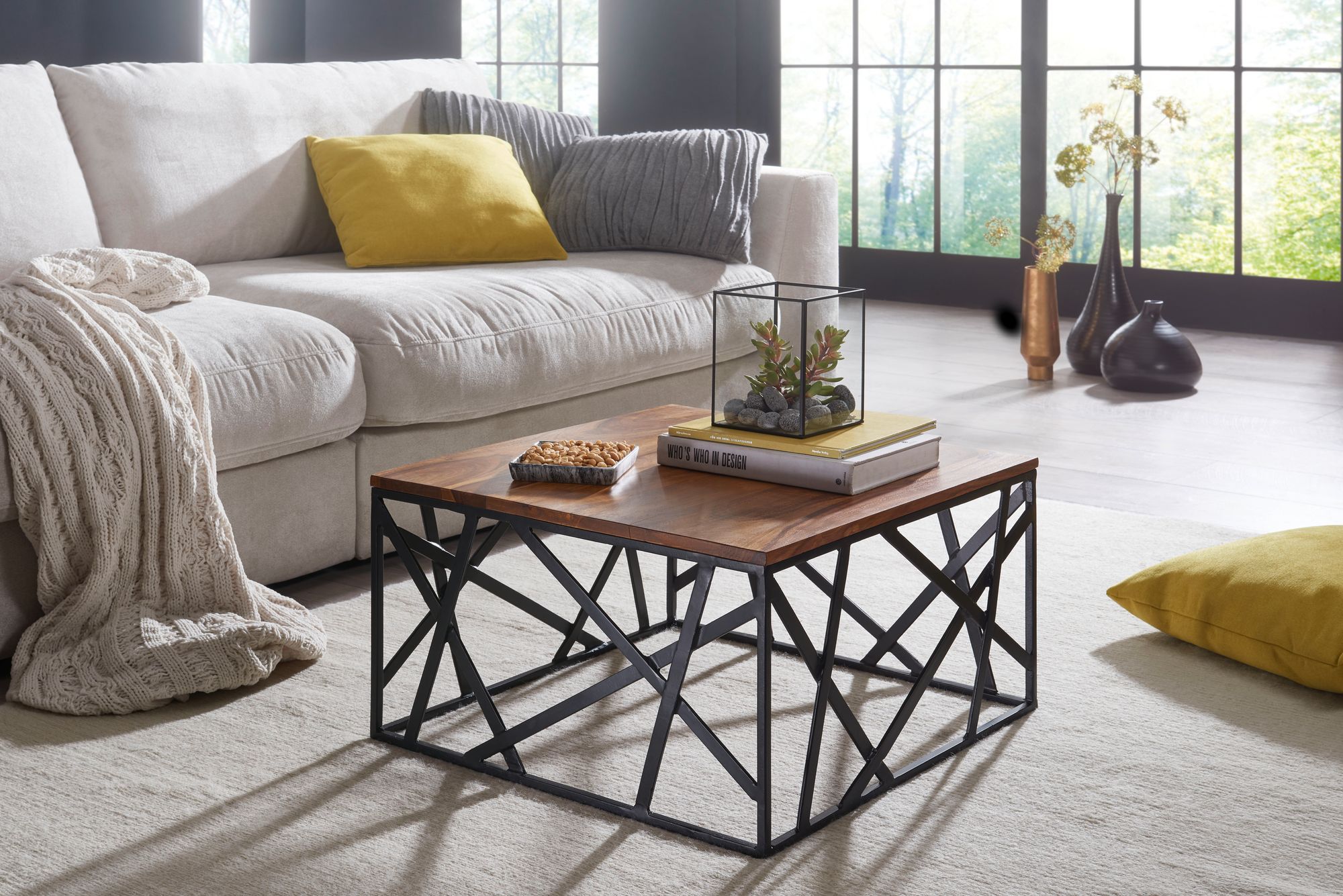 Objavte konferenčný stolík BAKAL s autentickým priemyselným dizajnom, vyrobený z masívneho dreva Sheesham a matného čierneho kovového rámu. Štvorcová plocha 60x60 cm poskytuje funkčný priestor pre vaše veci, zatiaľ čo kovové nohy zabezpečujú dokonalú stabilitu.