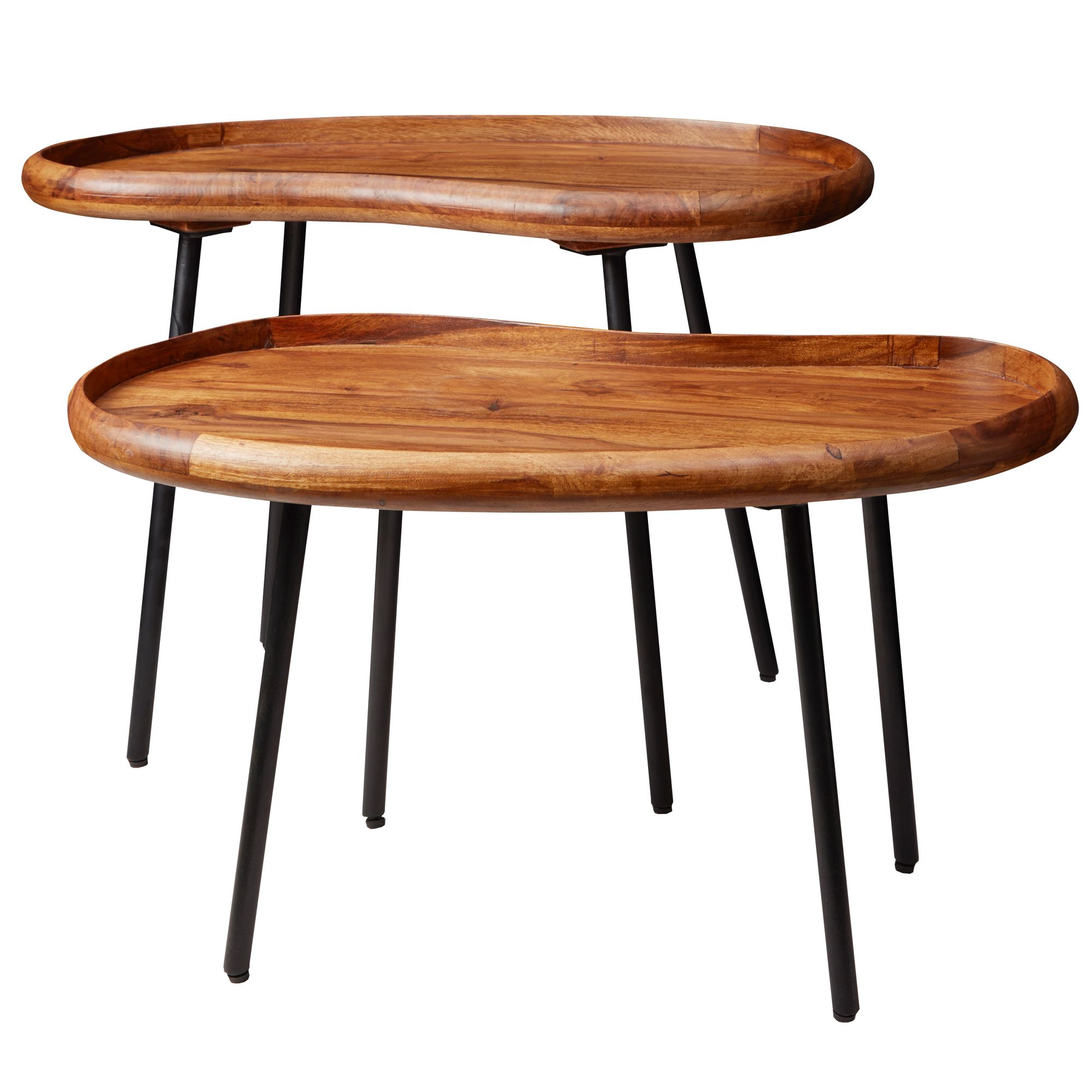 Prineste do svojej obývačky retro šarm s týmto konferenčným stolíkom z masívneho Sheesham dreva. Doska v tvare obličky s rozmermi 71x42x40 cm je podporená čiernymi kovovými nohami pre dlhodobú stabilitu.