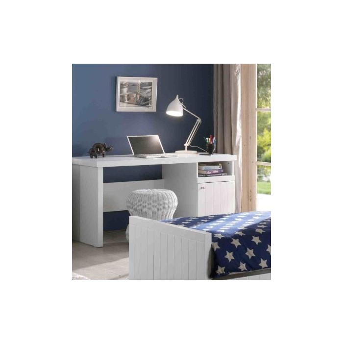 The ROBIN desk is made of white lacquered MDF combined with solid pine. The cupboard of this desk can be mounted on either the left or right and has an adjustable shelf on the inside. The door of this cabinet is finished with fine vertical grooves and features a soft-close system. This desk also features a practical storage space above the cabinet.
