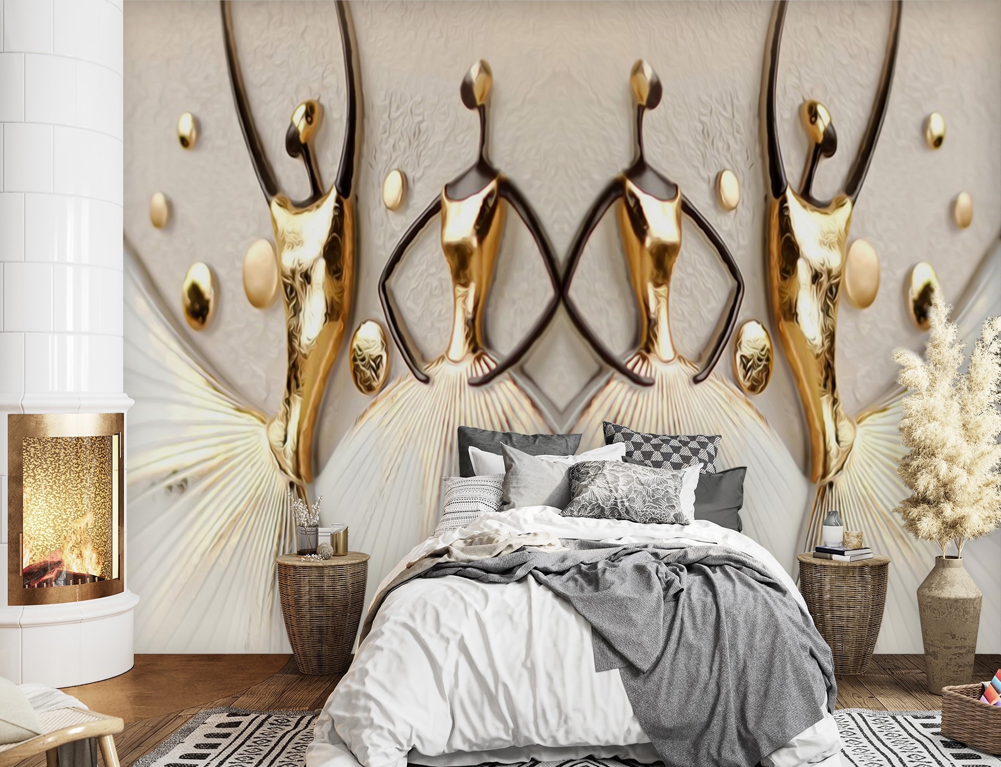 Popis a charakteristika - Fotostena do obývačky v očarujúcej zlatej farbe v štýle tanečných siluet